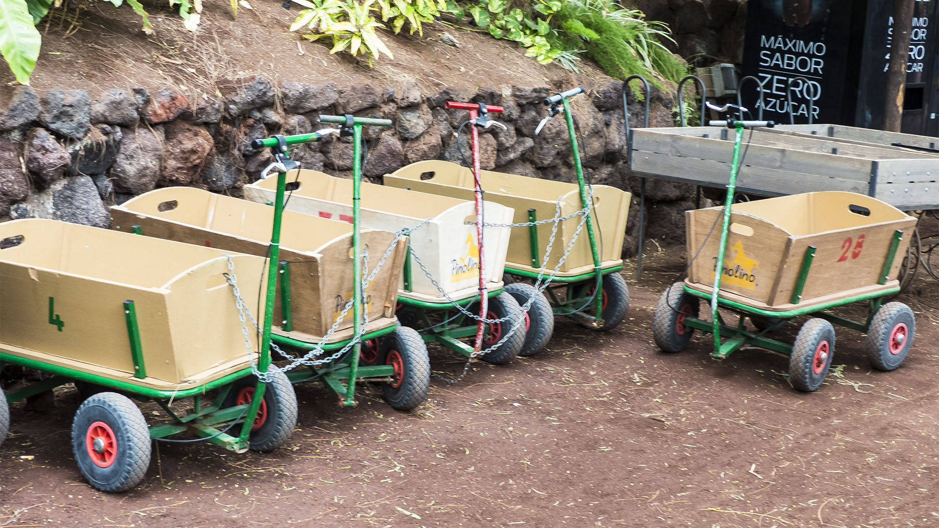 Neben dieser zentralen Infrastruktur hat sich der Oasis Park auch allerlei "Kleinigkeiten" einfallen lassen, die den Besuch wesentlich erleichtern oder erst ermöglichen. Wer nicht mehr so gut zu Fuss ist, wird den Weg hinauf auf den Hügel, auf dem die sehenswerte Greifvogel Schau stattfindet, in der Sommerhitze nicht mehr so leicht schaffen. Eine kleine "Pendelbahn", die von einem Traktor gezogen wird, verkehrt und bringt auch Gehfaule auf den Hügel. Auch Elektro-Scooter lassen sich am Eingang mieten, die Menschen mit Handycap die Bewegung im Park ermöglichen und auch stark genug sind, den Hügel hinauf zu kommen. Eltern mit Kindern, die noch nicht den ganzen Tag alleine auf den Beinen verbringen können, haben die Möglichkeit einen hübschen Leiterwagen am Eingang zu mieten, in denen die Kids durch den Oasis Park "befördert" werden können.