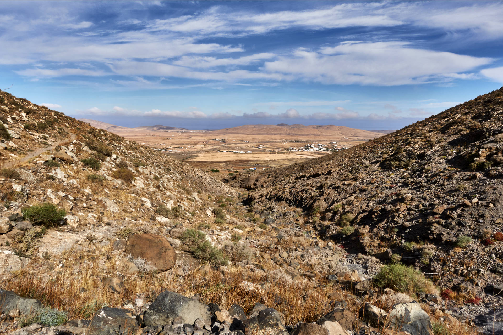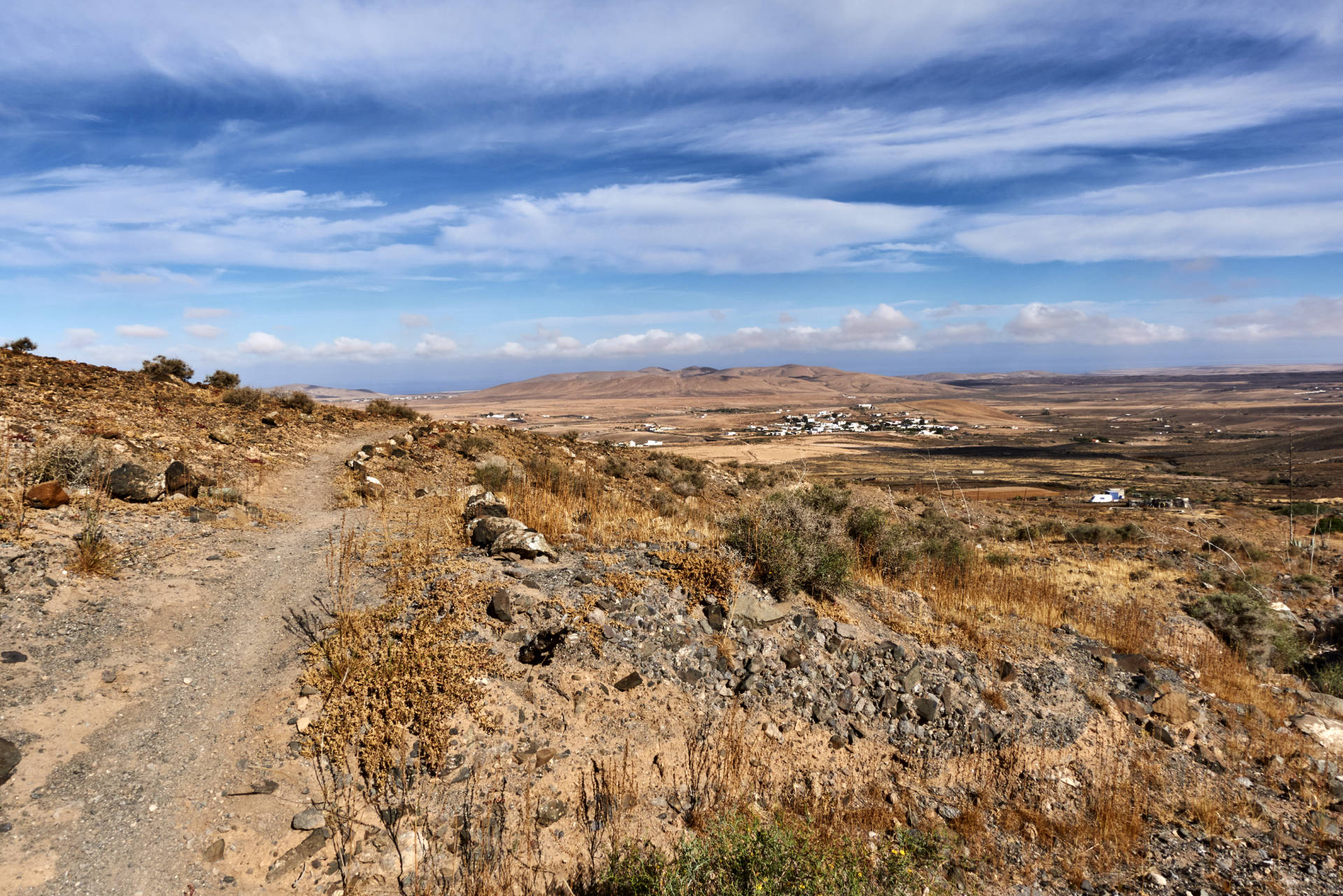 Die Westküste im Blick, die Ebenen von Tefía unter sich, geht es durch felsiges, steileres Gelände in Serpentinen zügig abwärts. An einigen Stellen ist der Pfad etwas ramponiert, schmal und rutschig (Stand 05/2023), dort aufpassen. Das Ganze wirkt fast wie ein alpiner Steig. Wie so oft sehen die steilen Bergflanken aus Vulkangestein auf Fuerteventura anspruchsvoller aus als sie sind, aber trotzdem nicht unterschätzen. Immer wieder stürzen auf der Sonneninsel Wanderer ab. Nachdem das obere, steilere Drittel gemeistert ist, wird es angenehm und ein namenloser Wasserlauf wird gequert. Der barranco ist ein Seitenarm des Barranco de Jarugo, der durch viele Seitenarme zu imposanter Grösse anwächst und am herrlichen Playa de Jarugo ins Meer mündet. Weiter südlich entspringt an den Flanken des Pico de la Fortaleza (601 m) der Barranco de Taro, ein sehr wasserreicher und einst wichtige Wasserader, als die Ebenen um Tefía noch Teil der kanarischen Kornkammer waren. Wer die Ebenen durchwandert, wird überall Staudämme, Kanäle und Zisternen (los aljibes) entdecken (Bilder siehe Tefía).