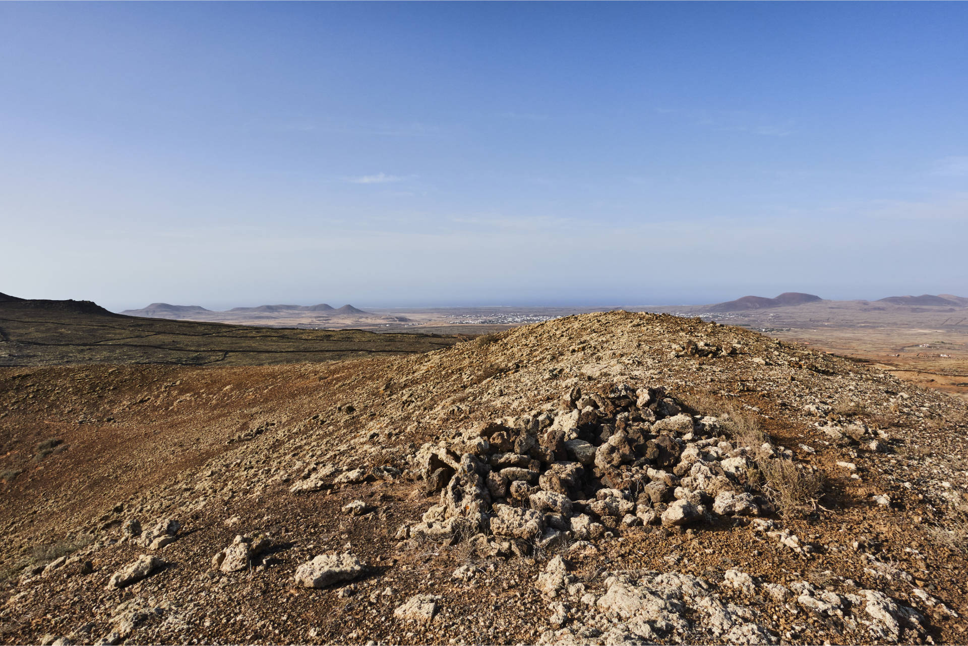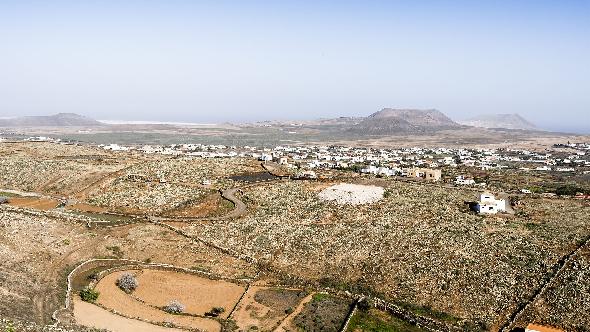 Ab dem kleinen Pass geht es immer abwärts mit weitem Blick auf die Ebene und die Westküste Fuerteventuras. Besonders schön ist das am späten Nachmittag, wenn die tiefe Sonne vom Meer hinüber strahlt, die erdfarbene Landschaft in ein noch wärmeres Streiflicht taucht, das die Gegend plastisch profiliert und die Vulkane, die in der Ebene stehen, herausarbeitet. Am schönsten ist daher erst am Nachmittag in Villaverde aufzubrechen und im langsam schwindenden Licht Richtung Lajares unterwegs zu sein. Das hat einen ganz besonderen Reiz.