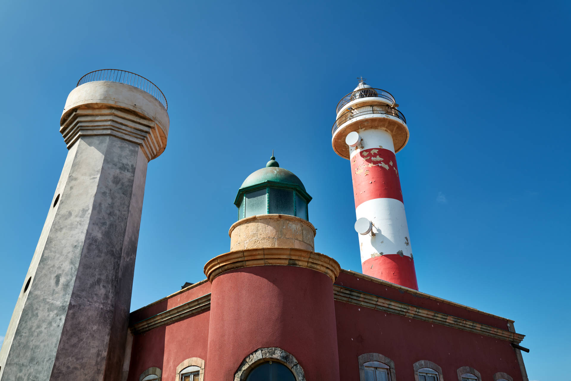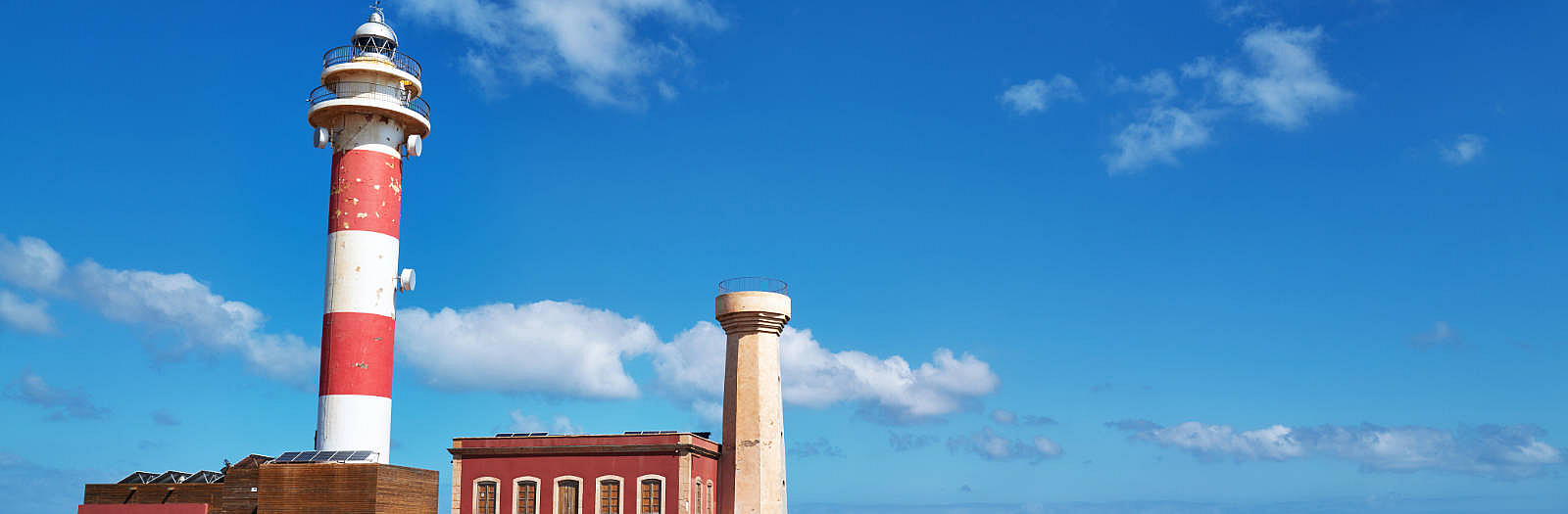 In Summe wurden drei Leuchttürme gebaut, die alle erhalten sind. Der erste überragt kaum das Wirtschaftsgebäude und liegt heute eigenartig, wie ein Miniaussichtsturm mit grossen Glasfenstern, am nördlichen Teil des Gebäudekomplexes. Betrieben wurde er, wie damals üblich, mit einer Olivenöl Lampe. Er mass nur 6,5 m in der Höhe und wurde auf 9 Seemeilen ausgemacht. In der Nacht des 28. September 1897, als der Leuchttumrwärter auf Lanzarote erstmals das Leuchtfeuer auf Fuerteventura ausmachte, muss eine klare und dunkle Nacht geherrscht haben. Um die Sichtbarkeit des Leuchtfeuers zu erhöhen, wurde es 1923 mit einem Acetylen-Flasher ausgestattet und konnte so auf 12 Seemeilen ausgemacht werden. Doch das half alles nichts, denn bei hohem Seegang war das Leuchtfeuer, auf Grund seiner Höhe von 6,5 m, nicht mehr zu sehen.