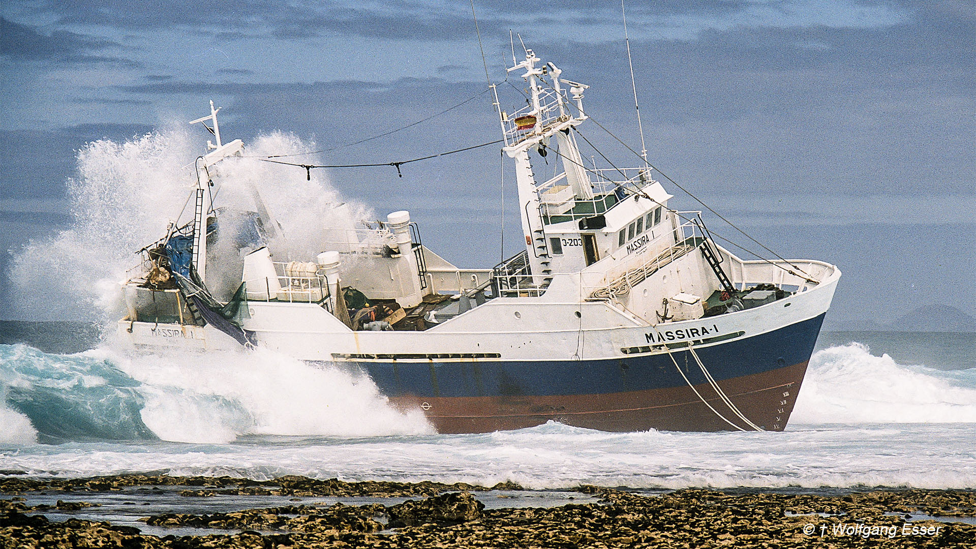 Der letzte Fischtrawler, dem die Klippen zum Verhägniss wurden, war die "Massira I" in der Nacht des 23. Oktober 1999. Das eigenartige "Eisentrum" auf den Klippen vor dem Leuchtturm, ist das letzte Überbleibsel von jenem. Er wurde dort abgefackelt, da die Fischladung langsam begann unangenehm riechend zu verfaulen. Warum die Massira I am Riff (N 28° 43' 01,0" | W 014° 00' 46,3"), das direkt vom Faro de Tostón aufs Meer hinausläuft, strandete, ist bis heute ungeklärt. Menschen kamen nicht zu schaden. Die gesamte Crew konnte fast trockenen Fusses an Land gehen. Im Ort El Cotillo erzählen Ältere noch heute Geschichten von einer angeblich angetrunkenen Crew, die leichte Damen dabei hatte. Das mag nicht viel heissen, denn in El Cotillo wird viel geredet. Nicht umsonst trägt der Ort seinen Namen: "El Cotillo", "Der Klatschsüchtige". Die Wetterdaten der historischen Nacht, halten jedenfalls einen leicht bewölkten Himmel bei guter Sicht, Wind aus Nord auf Nordost drehend, bei 20 Km/h, 27 Grad Celcius, fallend auf 10 Km/h, 24 Grad Celcius, fest. Für den Atlantik und die Küsten des kanarischen Archipels bestes Badewetter. Bei diesen Bedingungen direkt vor einem Leuchtturm ein Schiff zu versenken, ohne Motorschaden, scheint annähernd unmöglich.