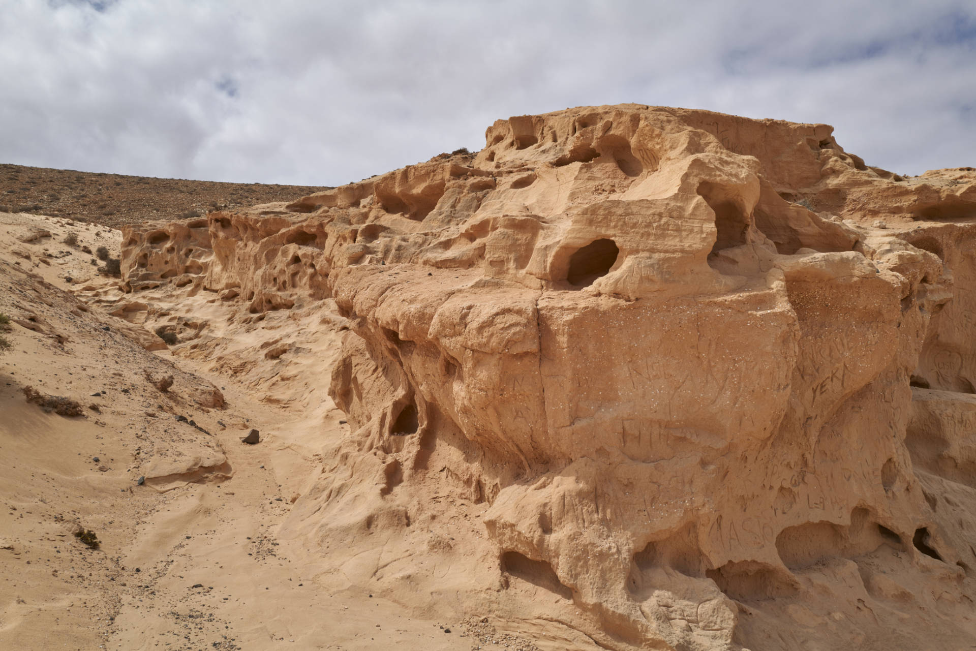 Bitte, ritzen Sie keine Namen in den Sand, wie das einige Dummköpfe schon getan haben. Beginnt einer folgen hunderte. Es interessiert wirklich niemanden ob "Hans & Lotte aus Hamburg" schon dort waren. Die Natur hat zehntausende Jahre gebraucht diese Schönheit zu erschaffen, zerstören Sie das nicht unwiederbringlich in Sekunden mit dummen Sprüchen. Sich mit Ritzungen verewigen zu wollen ist nicht nur lächerlich, sondern auch erbärmlich und machen nur kleine Wichte mit Mindewertigkeitskomplexen. Verlassen Sie den Barranco so schön, wie Sie ihn vorfanden! Es ist auch nicht verboten Müll mitzunehmen, den jemand ignorant weggeworfen hat.