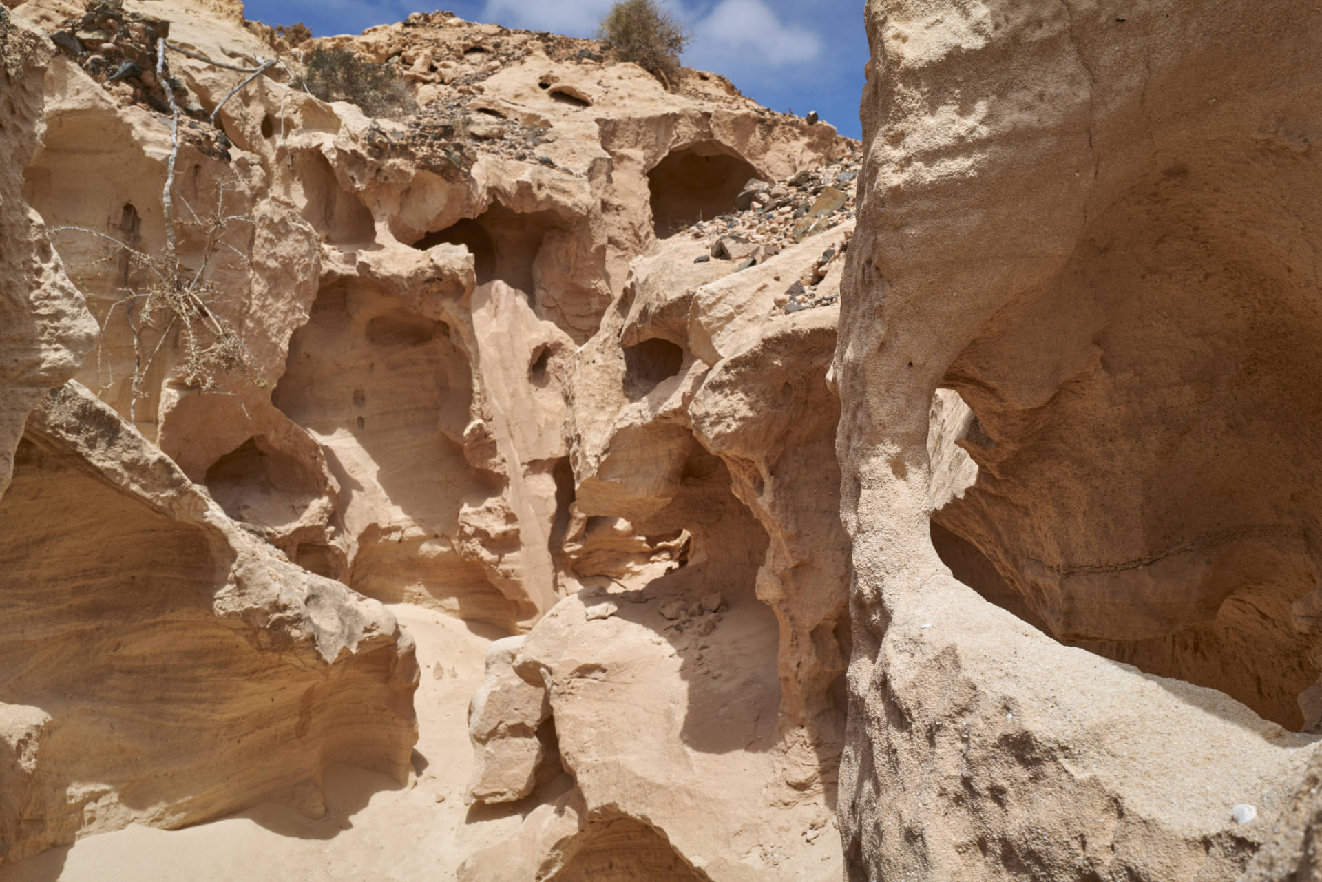 Der Barranco de Los Encantados ist die Schlucht der Verzückten. Bizzare Formen gepressten Sandes formen auf einigen Strecken die Seitenwände. Ehemaliger Meeresboden, der durch die Faltung der Atlantischen Platte entstand, Sedimente hart gepresst. Dort ergoss sich keine Lava über die Ursprünge der Insel, wie weiter im Norden beim Calderón Hondo (273 m) und Bayuyo (272 m), die erst vor 50 tsd. Jahren ausbrachen und das letzte Inselwachstum einleiteten.