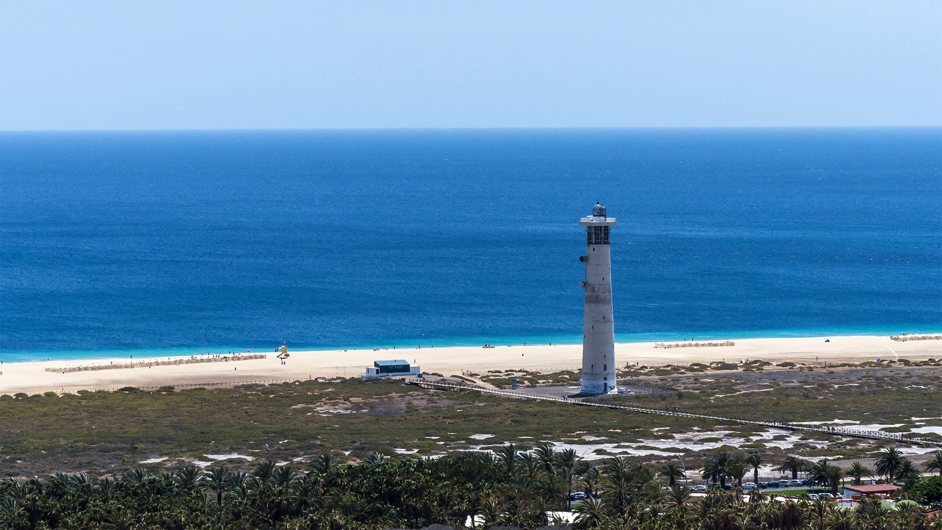 Spanien blickt auf eine lange Tradition der Leuchttürme zurück. Der "Herkulesturm" in La Coruña, der von den Römern ca. 110 errichtet wurde, steht immer noch und ist der älteste Leuchtturm auf unserem Planeten, der noch in Betrieb ist. Er war wichtiger Wegweiser für die Seefahrt, um die spanische Nord-West-Spitze zu umsegeln und an die galizische Nordküste zu gelangen. Reiche Eisenerzlager warteten dort. Der Faro de Morro Jable blickt auf keine so lange Vergangenheit zurück. Er stammt aus dem Jahr 1991 und da auf vollautomatischen Betrieb ohne Leuchtturmwärter ausgelegt, verfügt er über keine Wirtschaftsgebäude und Wohnungen. Das macht ihn nüchtern. Der Faro de Morro Jable markiert den südlichsten Punkt Fuerteventuras. Die pittoreske Schönheit eines Faro Martiño oder Faro de Tostón fehlt ihm. 59 Meter ist er hoch und da der Strand, auf dem er steht, ein paar Meter drauf legt, ist seine Feuerhöhe auf 62 Meter über Normalnull. Auch wenn er gar so nüchtern in der Gegend steht, darf er nicht fehlen, denn er schafft das schöne "Gesamtensemble" des Playa del Matorral. Auch wenn der Strand, wie der Playa del Matorral, noch so schön und perfekt ist, mit feinem weissen Sand und türkisfarbenem Wasser, wird er erst durch die Palmen am Paseo und seinen Leuchtturm, den Faro de Morro Jable, wirklich komplett. Wer einen perfekten Strand so definiert, der hat ihn mit dem Playa del Matorral gefunden. Heute haben optische Leuchtfeuer keine wesentliche Bedeutung mehr. In nautischer Hinsicht würde es auch ein Stahlmast mit einer Radarbarke tun, die ganz oben auf ihm rotiert. Aber eigentlich braucht die auch schon fast niemand mehr.