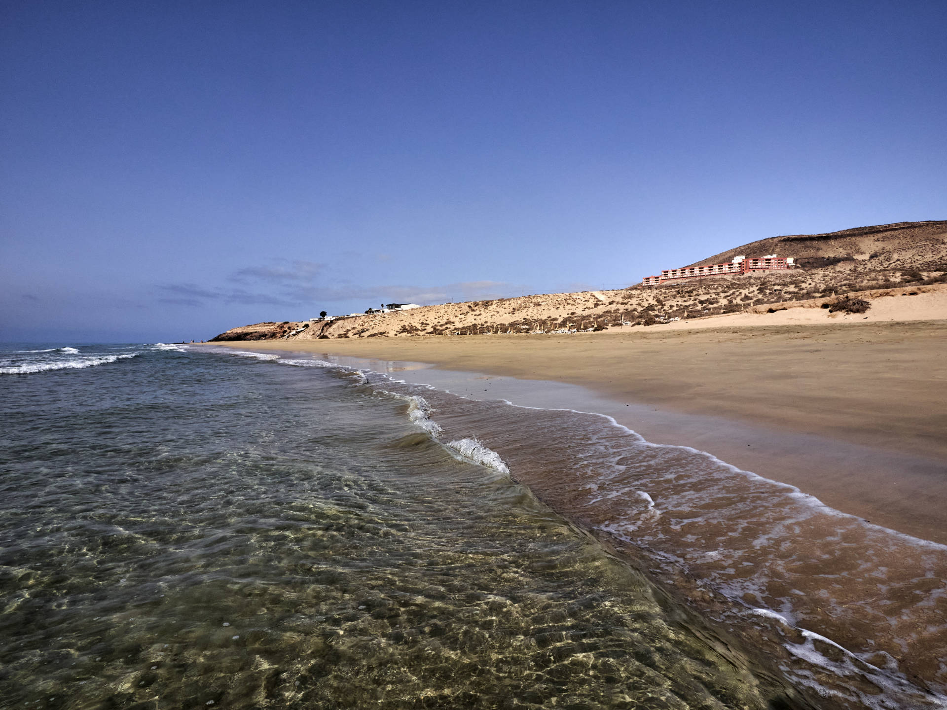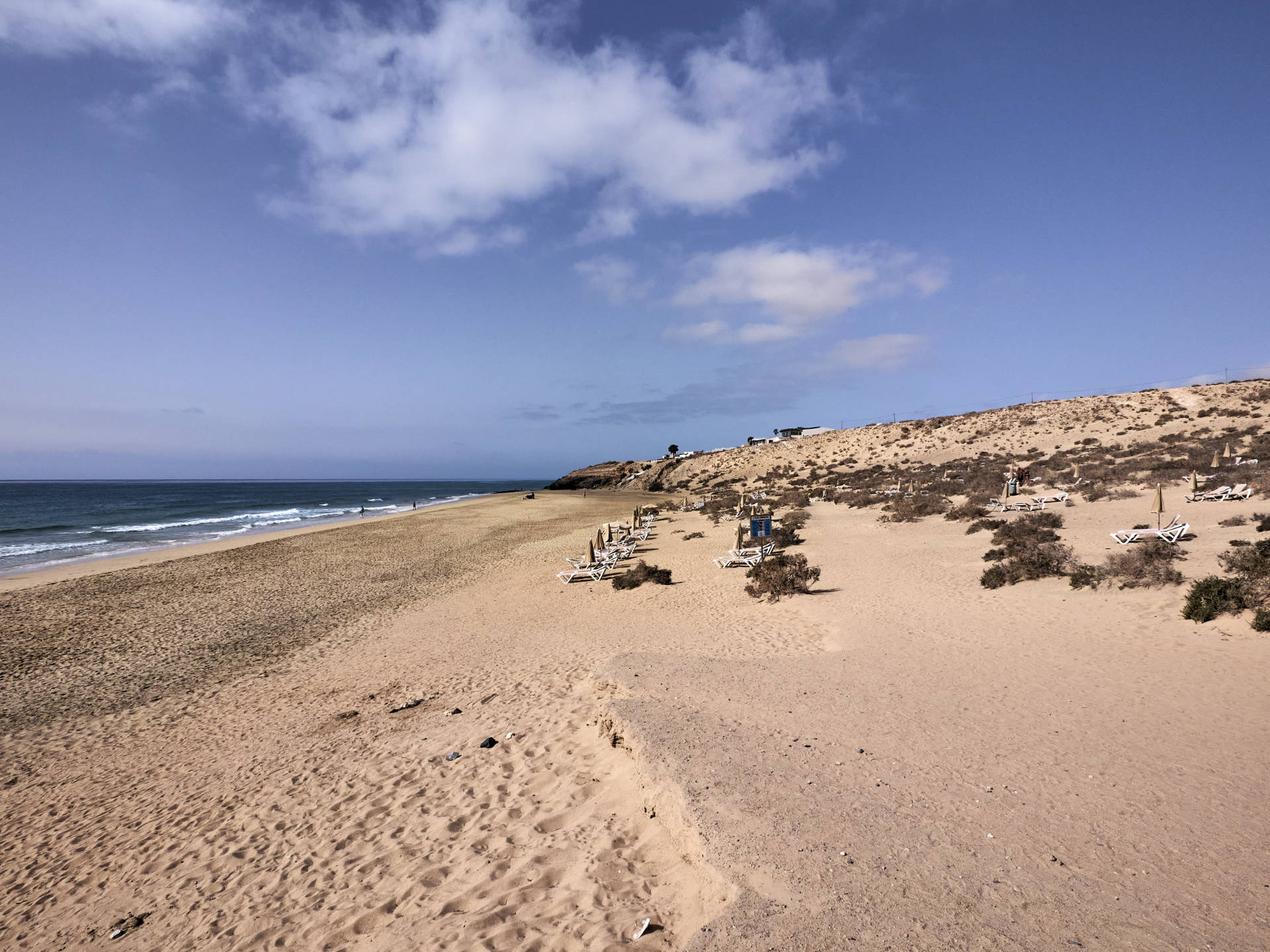 Wie am Nachbarstrand im Nordosten wurde auch hier eine Konzession für das Vermieten von Liegen und Sonnenschirmen erteilt. Das Cabildo de Fuerteventura ist diesbezüglich sehr restriktiv, da die Strände möglichst in natürlichem Zustand belassen werden sollen. Der Atlantik fällt am Playa Esmeralda sanft über Sandbänke ab. Das Wasser schimmert am frühen Vormittag smagragdfarben, daher auch der Name Playa Esmeralda. Werden die Playas de Costa Calma von einer wenig schönen Hotelfront begrenzt, die zwar den Nordost Passat abschotten, herrscht am Playa Esmeralda freie Sicht auf den Istmo de la Pared, die mächtigen Sanddünen, die sich bis an die Westküste hinüber ziehen. Das sind nur 7 Kilometer. Am Playa de Jandía aka Esmeralda ist es nicht ganz so windgeschützt wie an den Playas de Costa Calma, aber die grosse Düne vor dem Strand leistet auch gute Arbeit. In der kann auch schön in der Sonne gelegen werden. Die Sanddüne ist eigentlich ein Ausläufer des Montañeta de los Verodas (156m). Der kleine Berg, montañeta, ist eine einzige grosse Sanddüne.